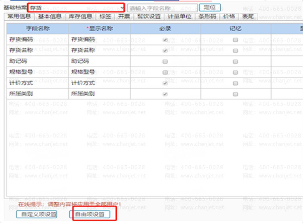 依次点击【系统管理】-【基础档案设置】,基础档案选择存货,点击【自由项设置】
