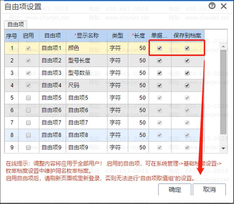 选择您需要设置的自由项行将【单据录入】和【保存到单据】勾选上即可:
