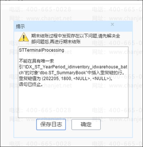 Q:业务结账提示:STTerminalProcessing不能在具有唯一索引"IDX_ST_YearPeriod_idinventory_idwarehouse_batch"ROXI≤"dbo.ST_SummaryBOOK"中插入重复键的行。