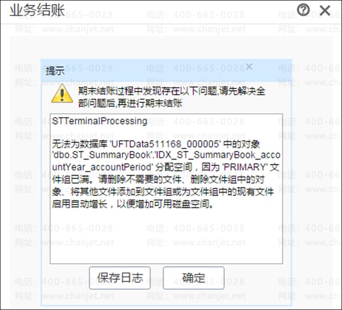 Q:业务结账提示:STTerminalProcessing无法为数据库XXX中的对象XXX分配控件,因为"PRIMARY"文件组已满。