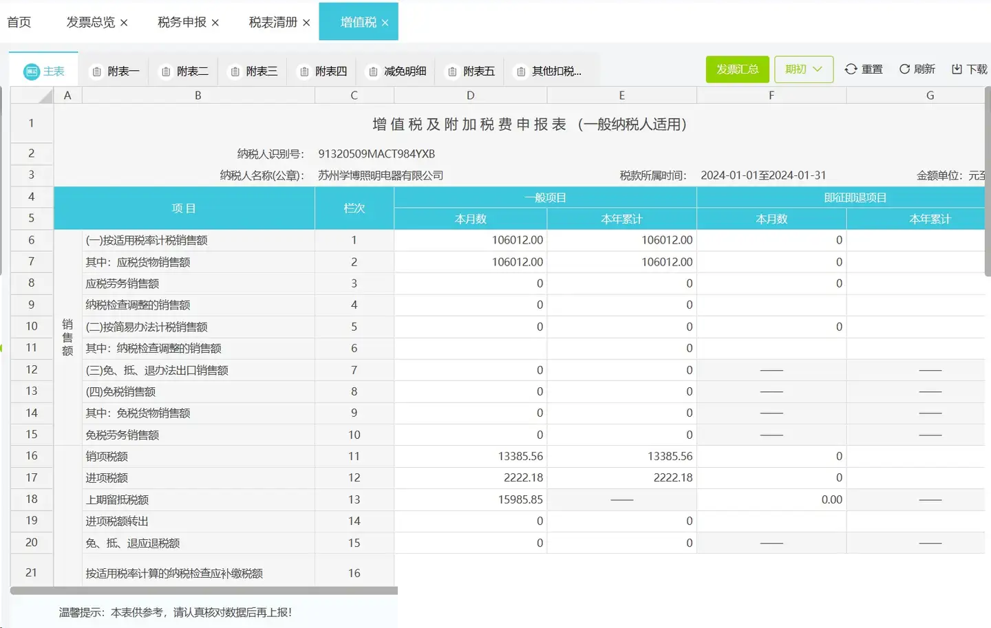 用友·好会计财务软件中,比较神奇的是,还能自动根据确认的发票情况和会计做账情况,自动生成报税表,税表跟税局要求报税的表是一样的: