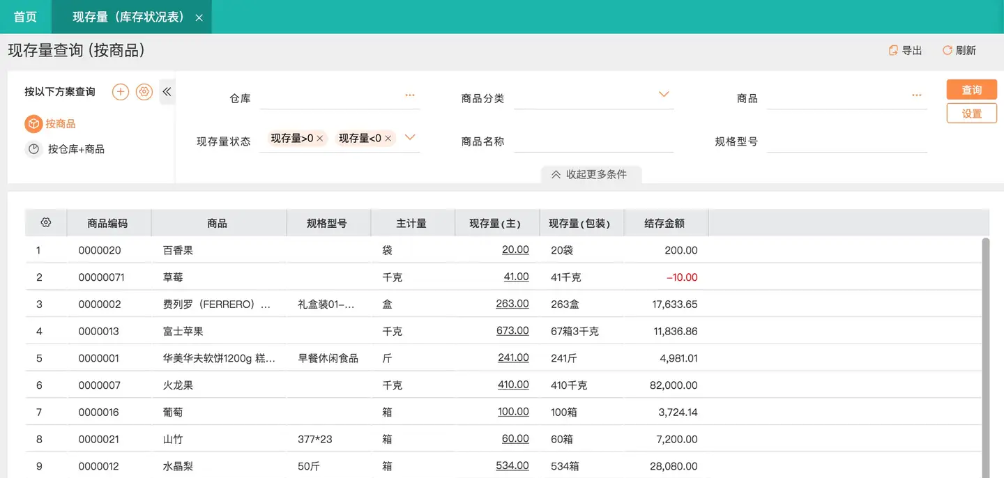 有入库、出库、多人同时盘点等核心功能,还可以从商品维度查看总结存量,也可以查询最明细的结存量,包括各仓库+商品+属性+批号的结存量,查询实时库存数量。