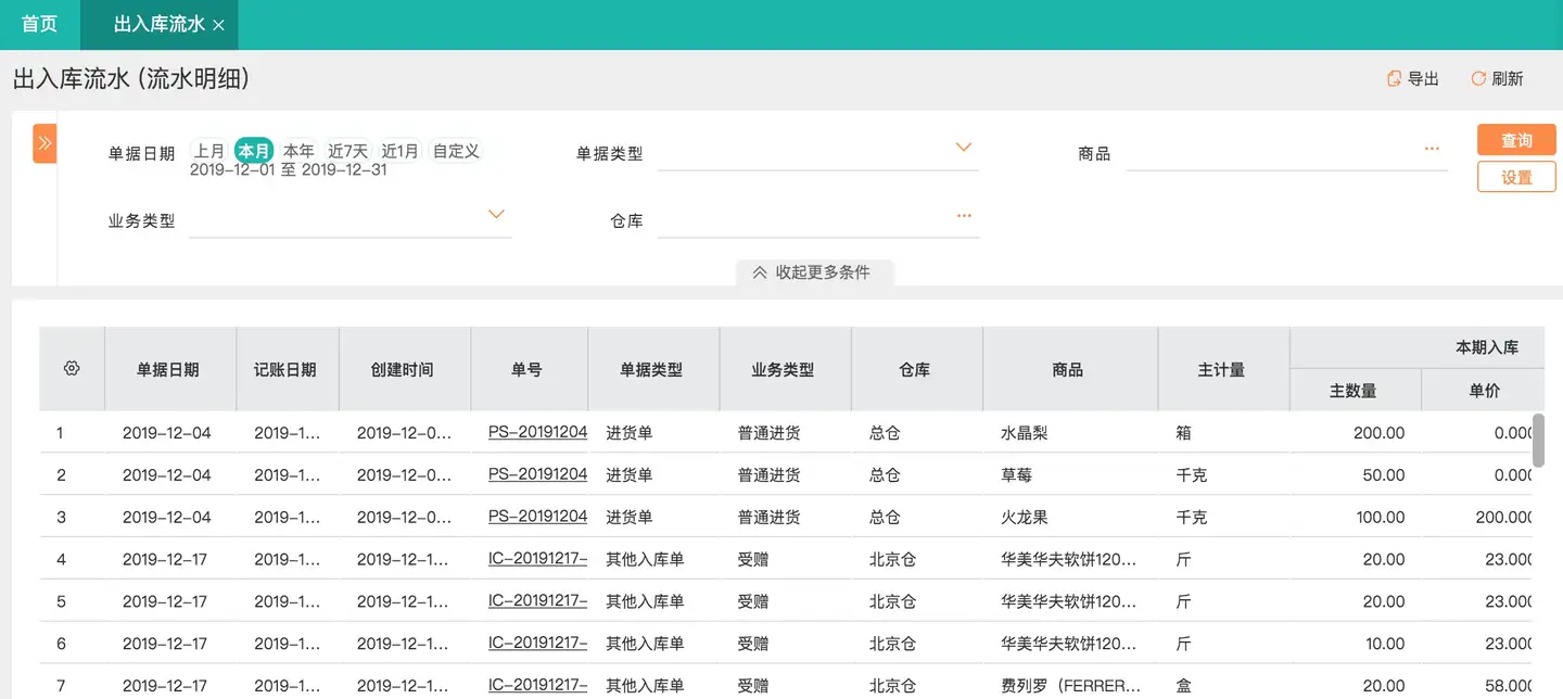 用于查询某一个时间段内商品的出库和入库情况,默认以发生的时间顺序展示的一个流水明细账。常用来核对业务发生与否,以及业务发生的数量是否正确,有时也需要了解商品的出入和结存情况是否正常。