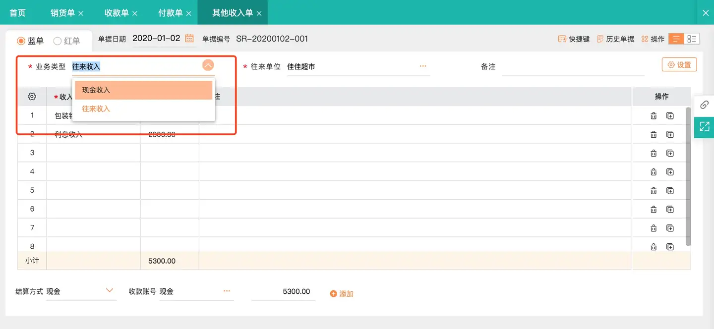 重点记录往来收付款,往来对账,日常收入费用记录及统计。还有其他收入单,系统通过业务类型进行区分,业务类型包括往来收入和现金收入。其他收入单录入了现结信息,包括结算方式、账号、结算金额,则会自动生成收款单。