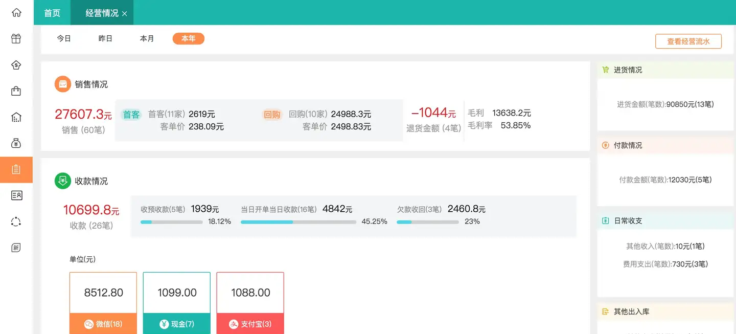 可以随时查到店铺的主要经营业务的发生情况,重点数据【点击】可以查看详情,按月、按年查看时支持按列表方式显示