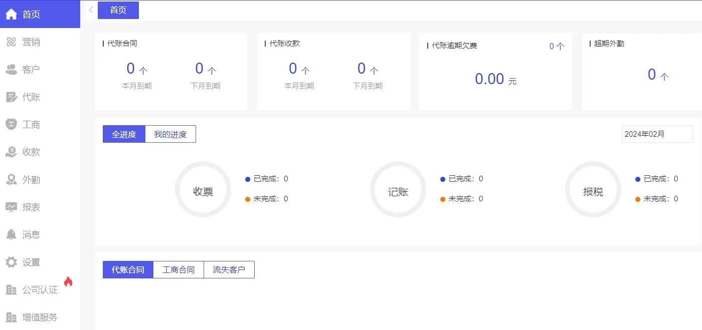 自动取发票、自动取回单、一键生成凭证、批量报税、工商社保、自动出报表、客户管理、代账进度、回款情况、风险监测等都是有的。