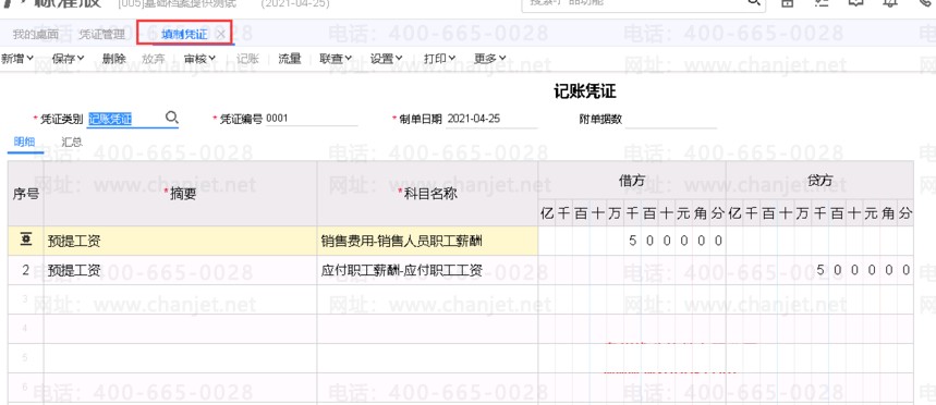 1、预提工资时,直接在总账做凭证如下图所示。