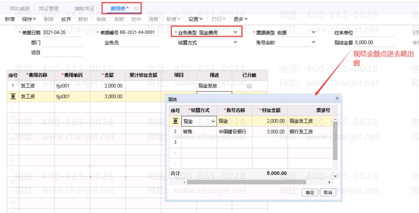 2、发放工资时如下图所示,做费用单,且必须费用类型为现金费用。