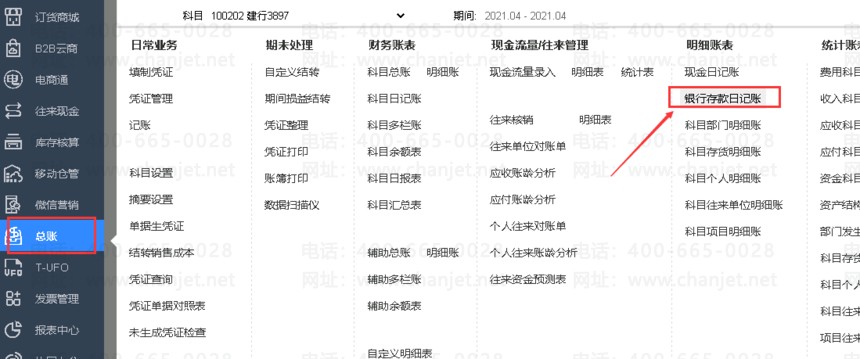 查总账-->银行存款日记账。