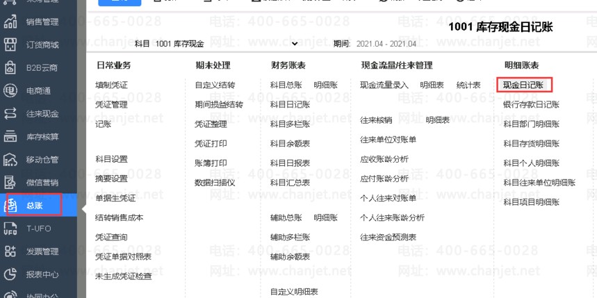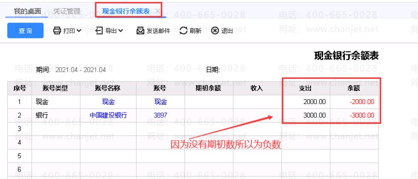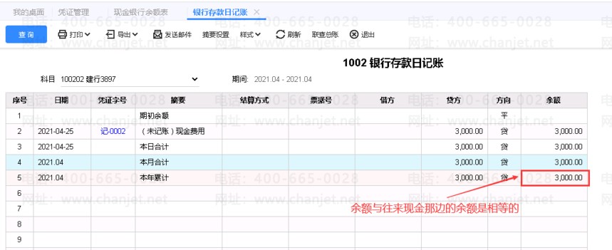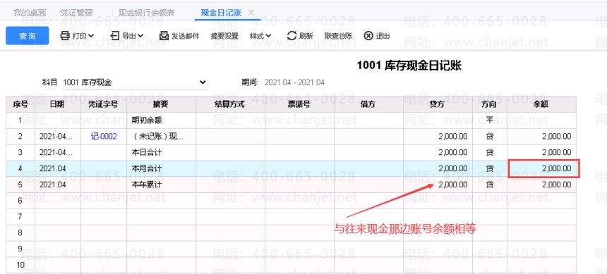 4、查往来现金-->现金银行日记账,如下图所示。