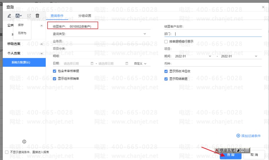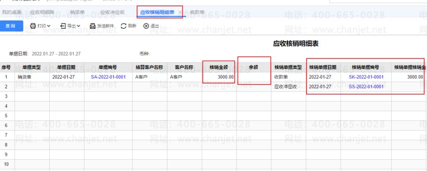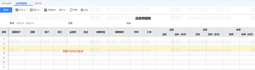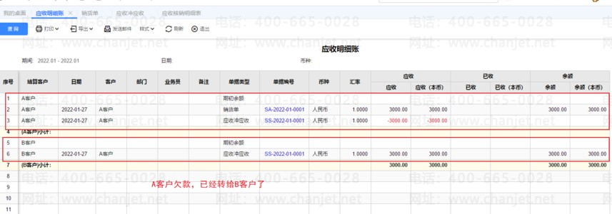 应收冲应收功能执行完后,这个时候查询,应收明细账,A客户已经没有欠款项了,B客户有欠款,如下图所示:
