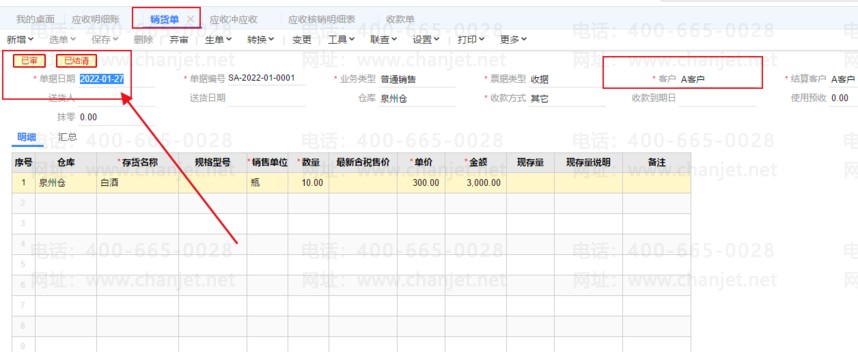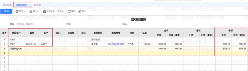 2、做完查询A客户应收明细账,如下图所示: