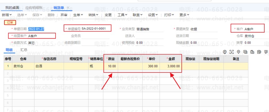 1、做一张销货单,数量10单价300金额3000元,如下图所示: