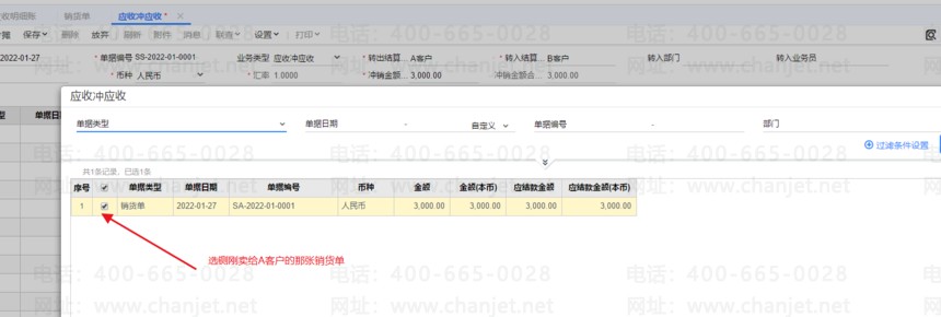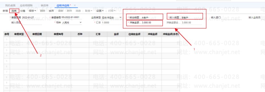 3、接下来我们把A客户的款转给B客户,用应收冲应收的功能,如下图所示: