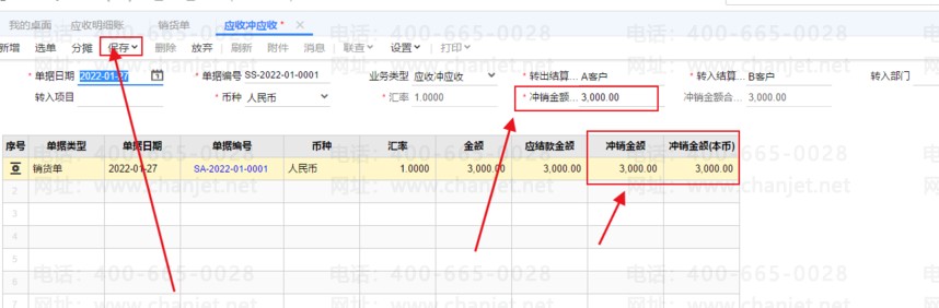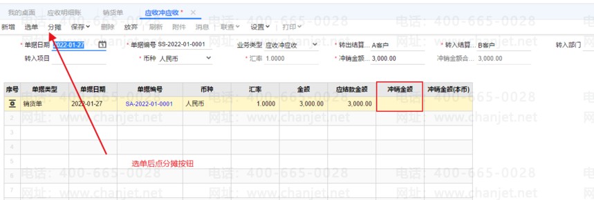 分摊按钮点后并保存如下图所示,冲销金额就会自动按表头的冲销金额填入。