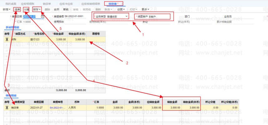 4、这种情况要等到,找B客户收款时,收款单开完,并与原A客户的销货单核销后,上面的应收款核销金额及,销货单的结清,才会有,开收款单选单、分摊、保存、审核时会自动核销,如下图所示:
