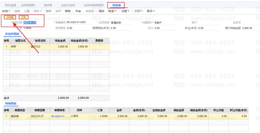 审核后自动核销后的收款单。如下图所示: