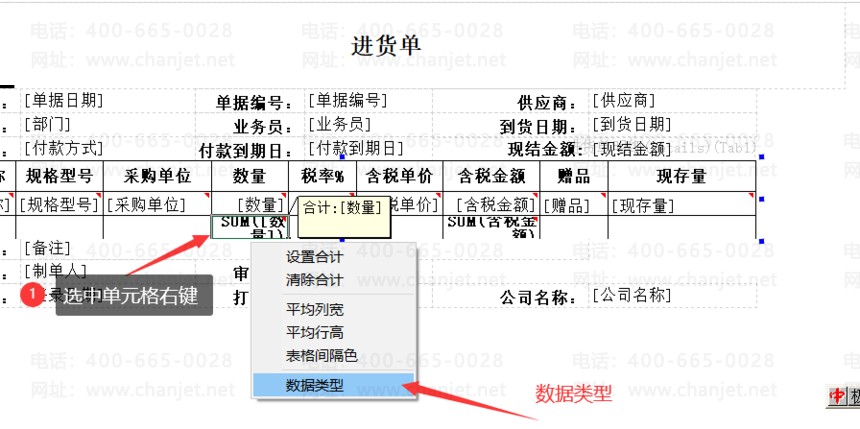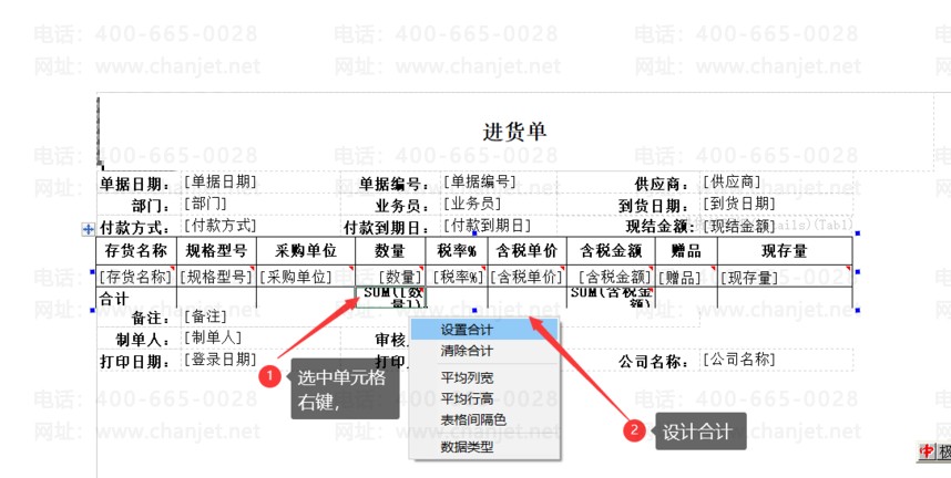 1、在进货单中,选中单元格右键,设计合计。