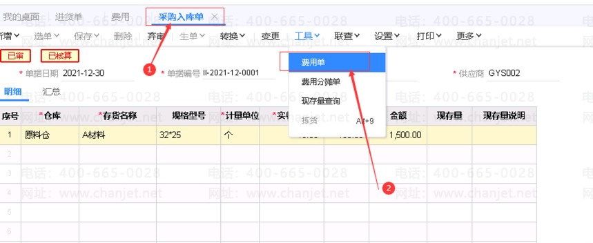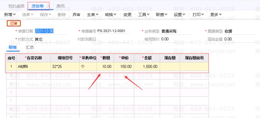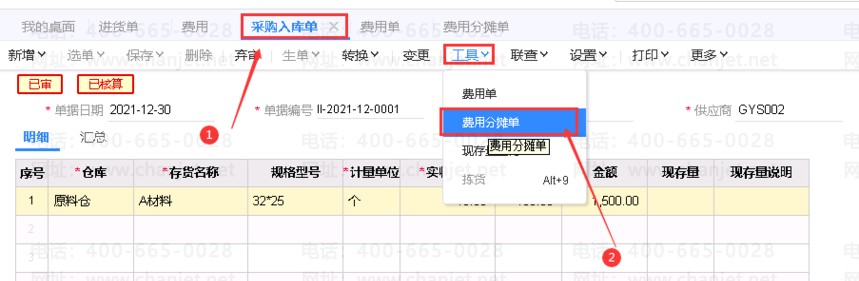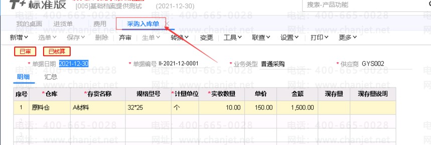 7、分摊完成后,采购入库单,重新刷新查询如下图所示;