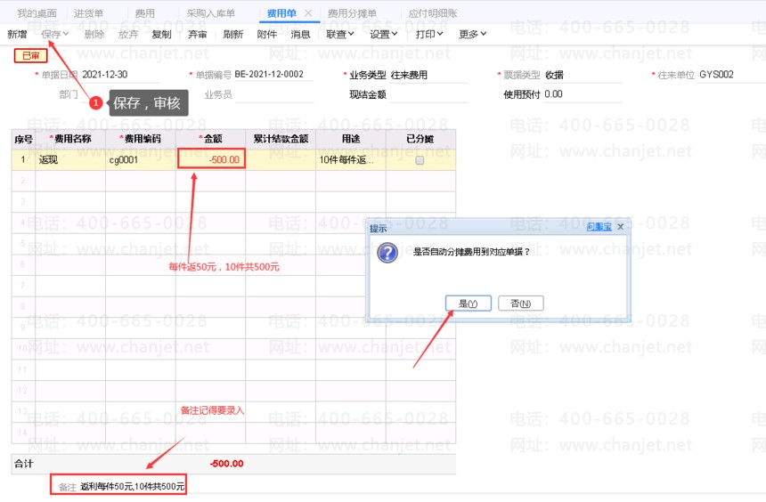 4、工具底下的费用单,做返利 10件每件返利50,总共返500元;