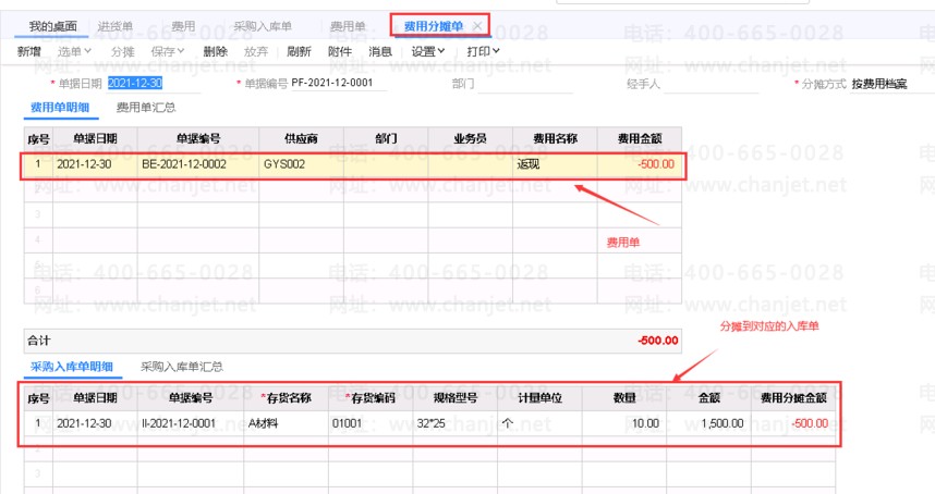 3、基础设置-->费用,增加一个类型为采购费用,返现的,并要勾选分摊,按数量;
