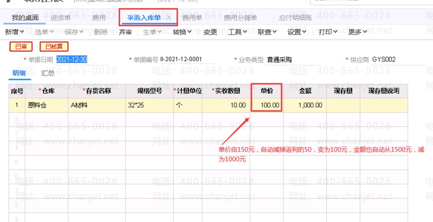 1、先做一张进货单 数量10 单价150元,返利每件是50元;