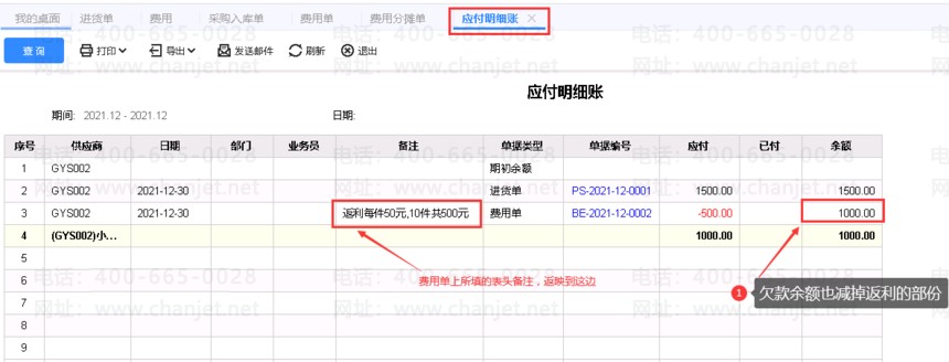 8、应付账款查询此时也为余额1000元,如下图所示 ;