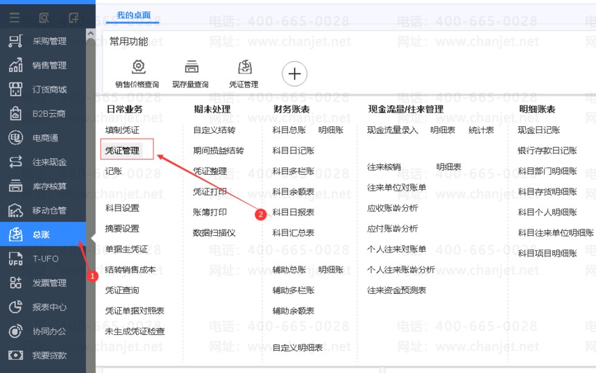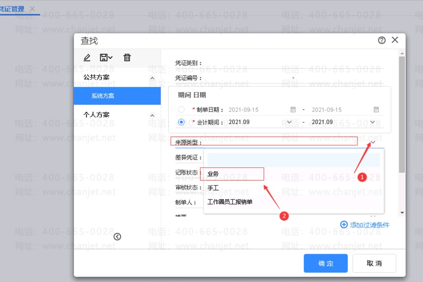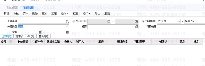 2.点击【总账】-【凭证管理】,在查询条件界面输入来源类型为【业务】,即可查询业务单据生成的凭证。