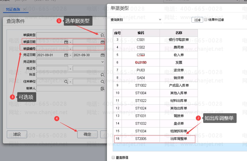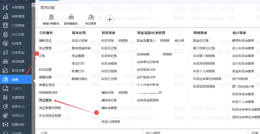 1.点击【总账】-【凭证查询】,在查询条件界面输入单据类型或单据编号,即可查询对应单据生成的凭证;