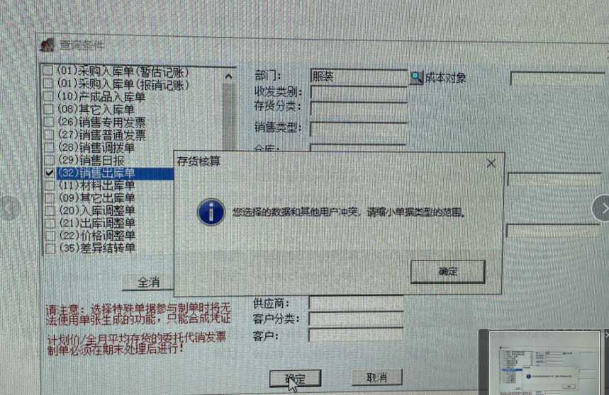 用友T6ERP存货核算制单提示您选择的数据和其他用户冲突,请缩小单据类型的范围