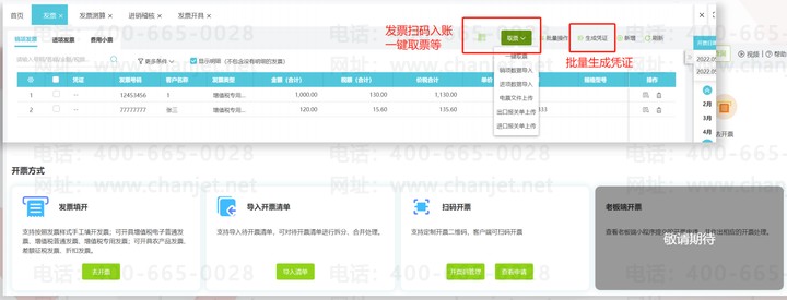 支持扫一扫取票、税盘取票,excel取票,电票文件上传进销项发票、费用发票一键生成凭证,发票税负测算,确保企业税负正常。