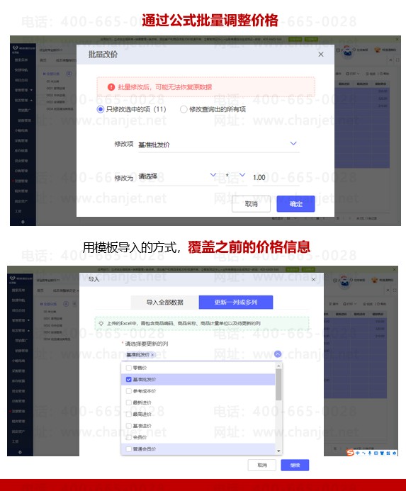 5. 商品批量调价:冻品原材料价格波动频繁,比如猪肉、鸡肉等大宗原料价格上涨后,成品成本会发生变化,好业财支持通过公式批量调整价格,或者用模版导入方式,覆盖之前价格信息