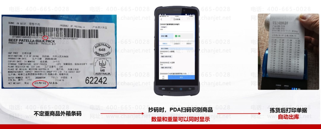 4.冻品行业存在特殊的抄码现象:每箱包装净重不同,好业财支持不定重商品外箱条码,抄码时,PDA扫码识别商品(数量、重量同时显示),打印后自动出库;