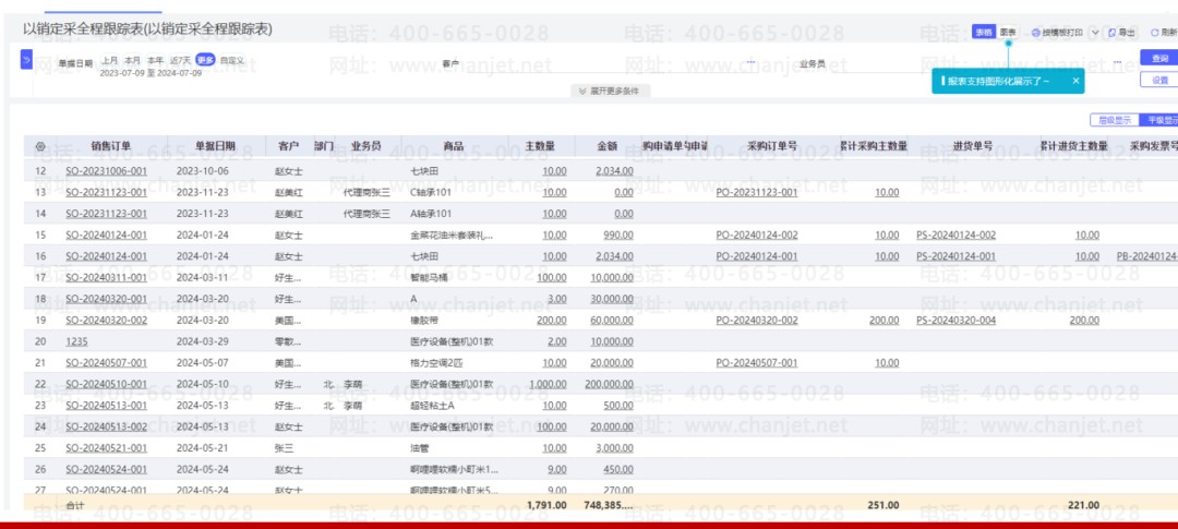 3. 以销定采全流程管理:根据销售订单自动流转到采购单据,进货与销货明细流转、追踪情况,一个图表上管理清楚