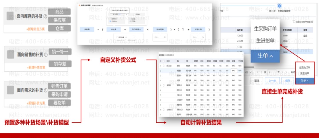 1. 按需智能补货:比如根据库存、销售情况、或需求订单精准计算需要补多少货,并且系统自动生成下游进货单据,既能保障库存满足销售,又能避免库存过量占用资金