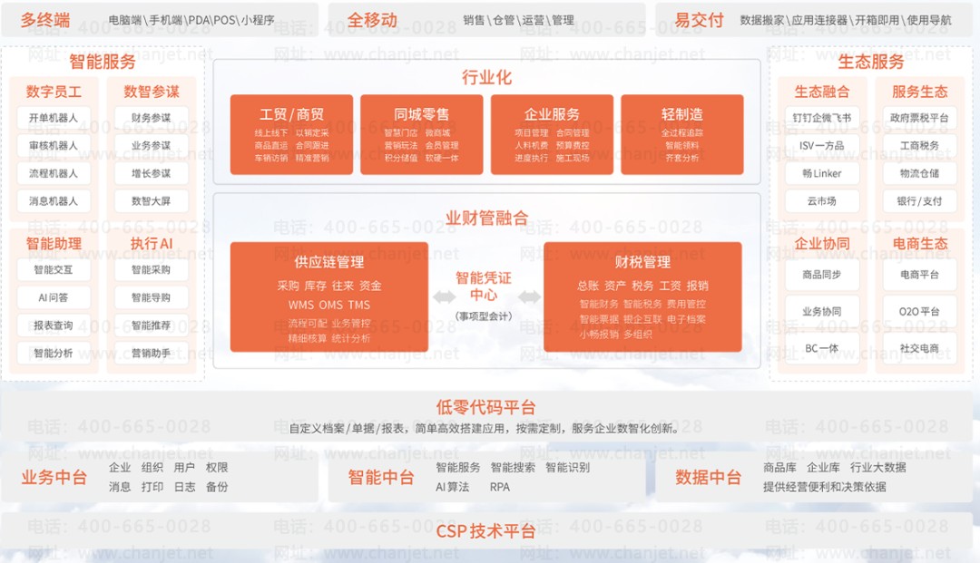 模块支持按需配置,可支持采购、销售、库管、车访销、WMS、客户管理、零售管理、项目管理、总账管理、发票管理、税务管理、线上商城等。