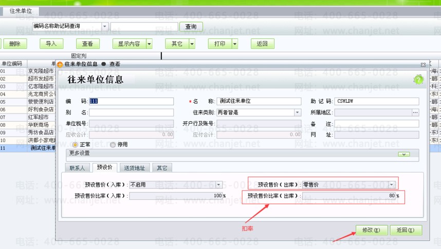 2.点击【基本信息】-【往来单位】,添加往来单位信息时,点击【预设价】页签,【预设售价(出库)】选择零售价,【预设售价比率(出库)】输入80,代表打8折;