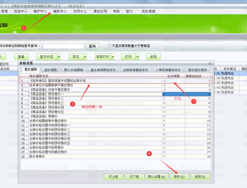 3.点击【辅助中心】-【价格系统设置】-【售价提取】,选中【往来单位基本信息中设置的出库价格】,点击【行上移】,移到第一行,然后双击,允许使用显示【√】;