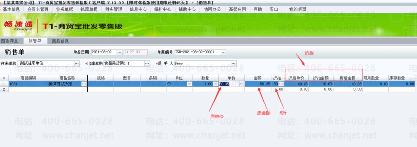 4.做销售单时,单价框内显示的是50.35,而不是40.28,您点击单据左边的【*】,将折扣,折后单价,折扣金额和折后金额都勾选,40.28显示在折后单价中。