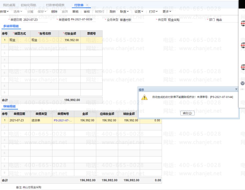 在收付款单上找到来源单据,对来源单据弃审,删除现结金额或者使用预收预付的金额就会自动删除的。