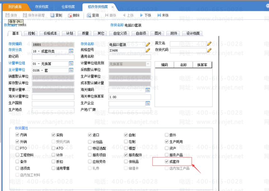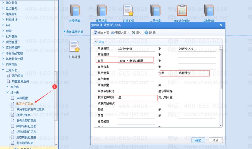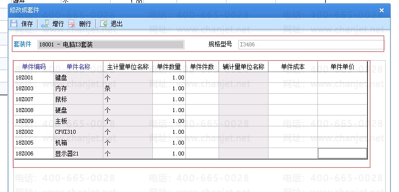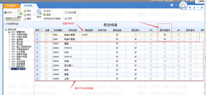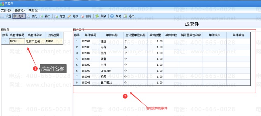 在《库存管理》和《销售管理》,用户既可对成套件进行统计,也可对成套件展开后的单件进行统计。 若需组装、拆卸、配比出库等业务请定义产品结构后使用。