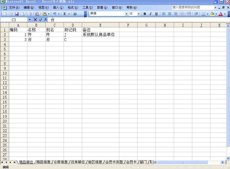 3)在EXCEL工作簿中包含“商品单位,自定义1,自定义2,商品信息,仓库信息等等”工作表,这些工作表就是基本资料导入的模板,不一定所有的基本信息都导入进去,只要把要导入的基本信息按照模板填好即可。一般情况下导入最多的就是商品信息,所以以商品信息为例来讲解如何导入。
