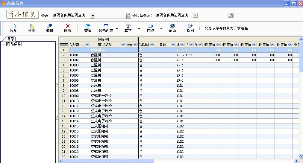 从图1-17可以看到商品信息都已经导入进来了,但是都是明细商品,没有大类商品,因此要进行大类的建立,然后把明细剪切和粘贴到大类下即可。首先建立个“台温机类”,如图1-18: