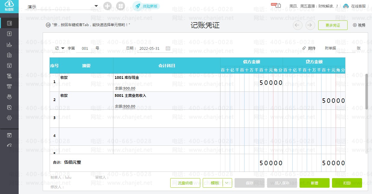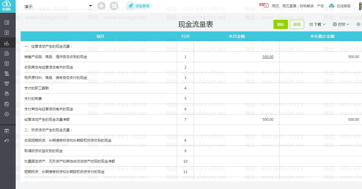 2、点击报表中心-财务报表-现金流量表,现金流量表已自动取数。刚刚做的凭证收到货款5500元已在现金流量表中体现。