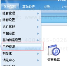 2、打开系统管理——用户权限,双击出现一个设置权限的界面。可以看到这里有几个默认的组别,其中账套主管组里面所有的权限都有,其他的两个组可以随意的权限自己设置。