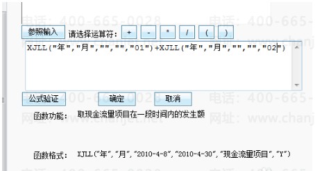4、如何想添加某个项目的,直接复制前面的公式单元“XJLL("年","月","","","01")“,然后在其后面添加一个“+”号,把公式单元粘贴 "XJLL("年","月","","","01"),并且把会计科目给修改成要添加的会计编码。如:“XJLL("年","月","","","01")+XJLL("年","月","","","02")”,点击确定就可以了。最后点击一下上面的保存即可。