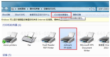 2、选中要添加纸张的打印机,然后点击“打印服务器属性”。