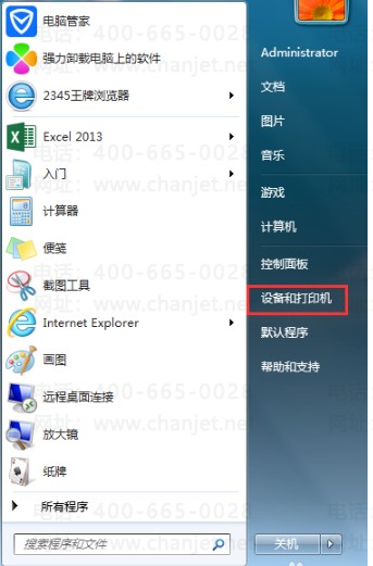 1、在开始菜单里打开"设备和打印机"。