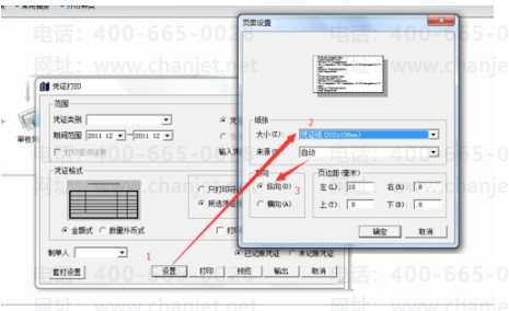 5、点击设置,在纸张大小处选择刚才新建的纸张“凭证纸”,方向选择纵向,再微调页边距,即可打印!