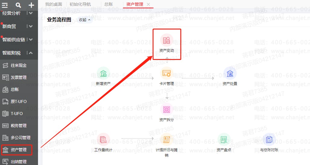 思路 :可以将资产卡片变动为不需要计提:点击资产管理,协助资产变动,点击进入使用状况设置。